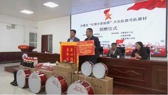 活动中,沙雅县民族团结进步促进会为沙雅县第六中学捐赠了4.46万元的少先队鼓号队器材,沙雅县第六中学为其敬献了锦旗。本次捐赠鼓号队器材有大军鼓8个、大镲8对、小军鼓16个、小镲4对、指挥棒2杖、队号28支、鼓号队整套服装66套,这批器材将助力学校发展壮大好少先队鼓号队,生动展现新时代少先队员的风采。