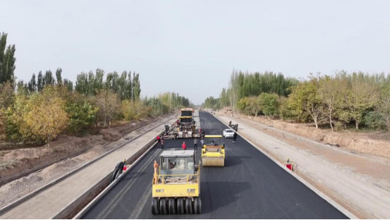 10月14日,在库车市城北新区横五路项目施工现场,机声隆隆,摊铺机、压路机、推土机等大型机械来回穿梭、高效运转,该项目为双向六车道,其整体轮廓已经成型,管线等基础配套设施完成铺设,正式进入沥青铺设阶段。城北新区道路项目总投资5.5亿元,包含8条道路修建工作,目前施工现场共调集100台各型机械,组织500多人进行紧张施工,预计11月底将完成所有施工任务。