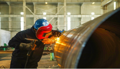 阿拉山口新博油气管道制造有限责任公司制造车间,工人在作业。
