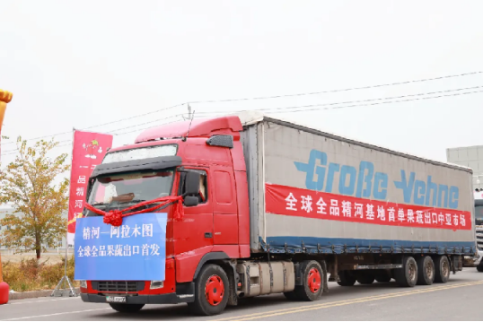 货车上张贴的“精河县茫丁乡蔬菜首出国门,全球全品精河基地首单果蔬出口中亚市场”红色标语,格外醒目。