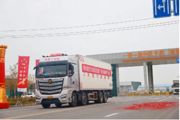 10月28日11时18分,两辆满载22吨本地蔬菜的大货车,从“一带一路”精河国际陆港出发,运往哈萨克斯坦。