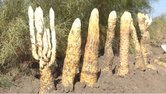 恰特喀勒乡的一种植户阿不都沙拉木·艾尔肯正是看到了这一模式的潜力,决定在自家土地上进行尝试。起先,他试着种植了300亩梭梭,并套种了大芸(肉苁蓉)。他密切关注市场行情,了解大芸的市场需求和价格变化,为后续的收获和销售做好了充分准备。经过一年的精心管理,阿不都沙拉木的梭梭套种大芸取得了显著成效。