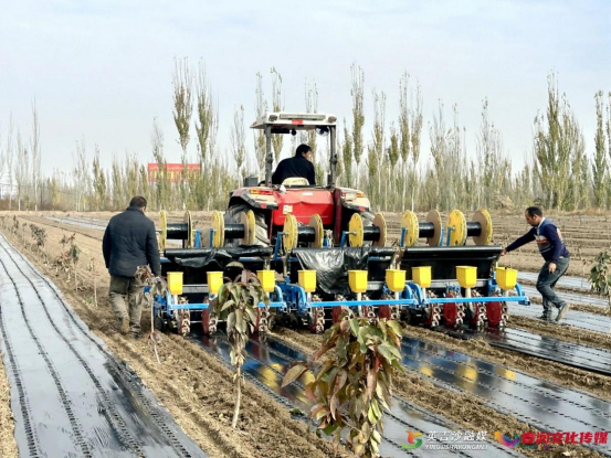 工作人员操作农机进行覆膜打孔。摄影:艾孜再姆