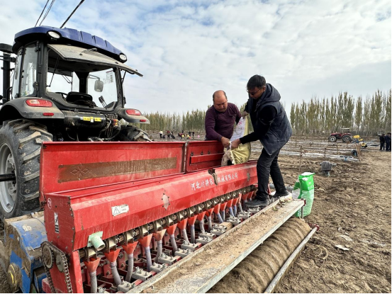 工作人员给精耕机添加化肥。摄影:艾孜再姆
