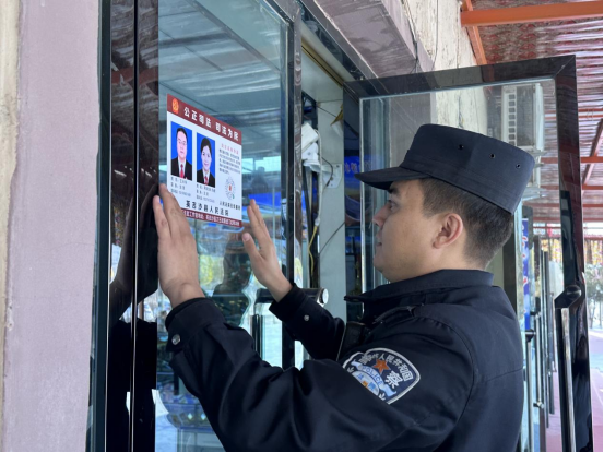英吉沙县公安局民警为店铺张贴法官信息。张素玮摄