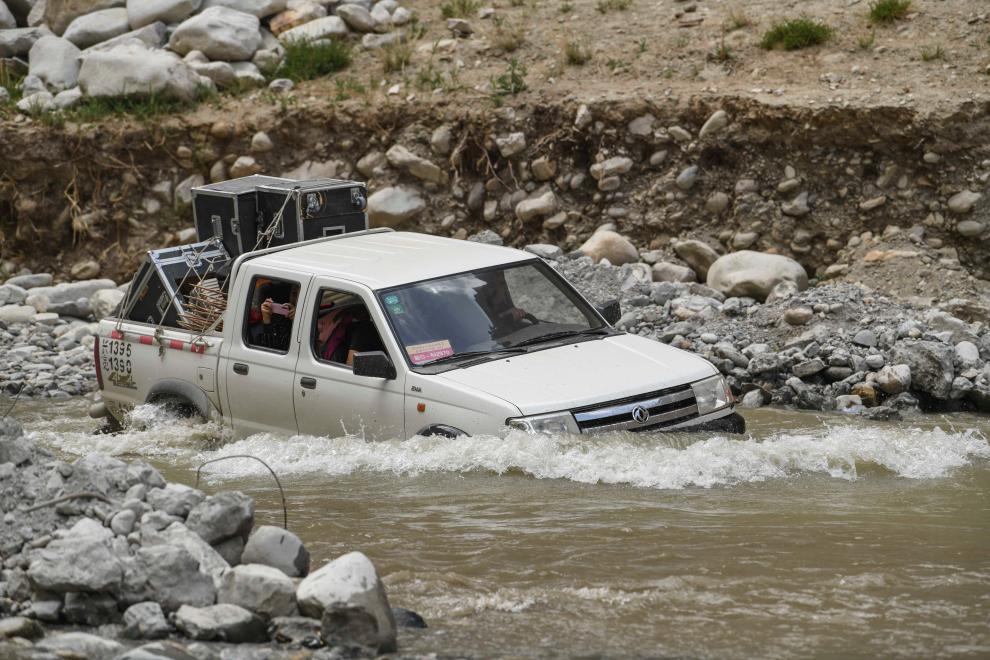 在一次下乡进村演出途中,新疆塔县文工团演员拜合提亚尔·居马汗和同事驾车穿越一处涉水路段(2020年6月5日摄)。