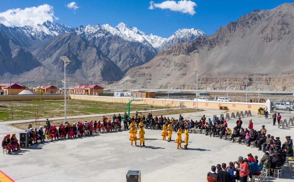 新疆塔县文工团演员在达布达尔乡的一处山村为村民表演舞蹈节目(2020年6月6日摄,无人机照片)。
