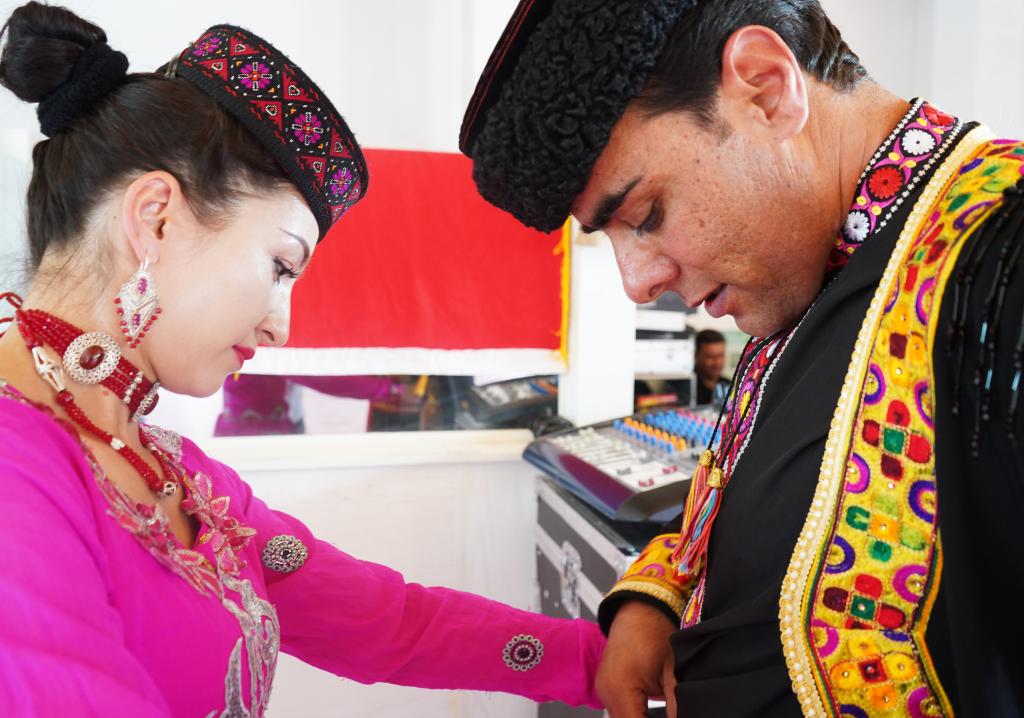 迎宾演出开始前,古丽巴努尔·库尔恰克为丈夫整理演出服装(9月4日摄)。