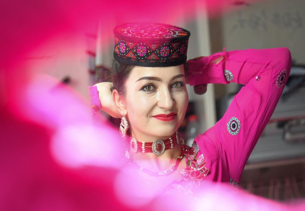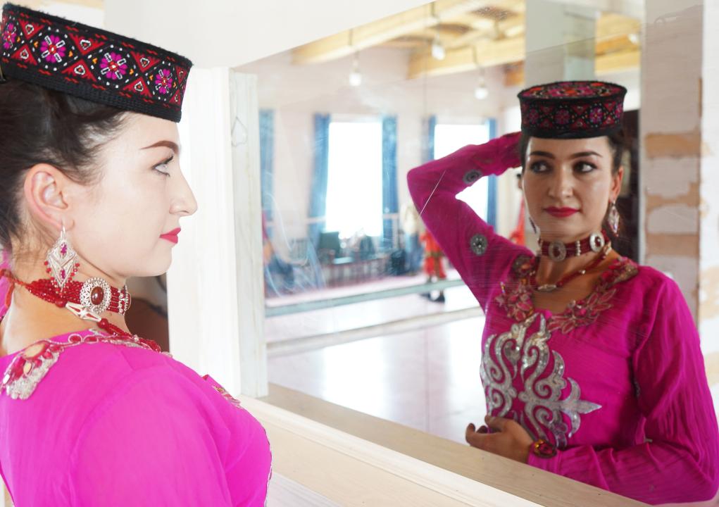 在新疆塔县帕米尔旅游区游客服务中心,古丽巴努尔·库尔恰克在排练室对镜整理服饰,准备当天下午的迎宾演出(9月4日摄)。