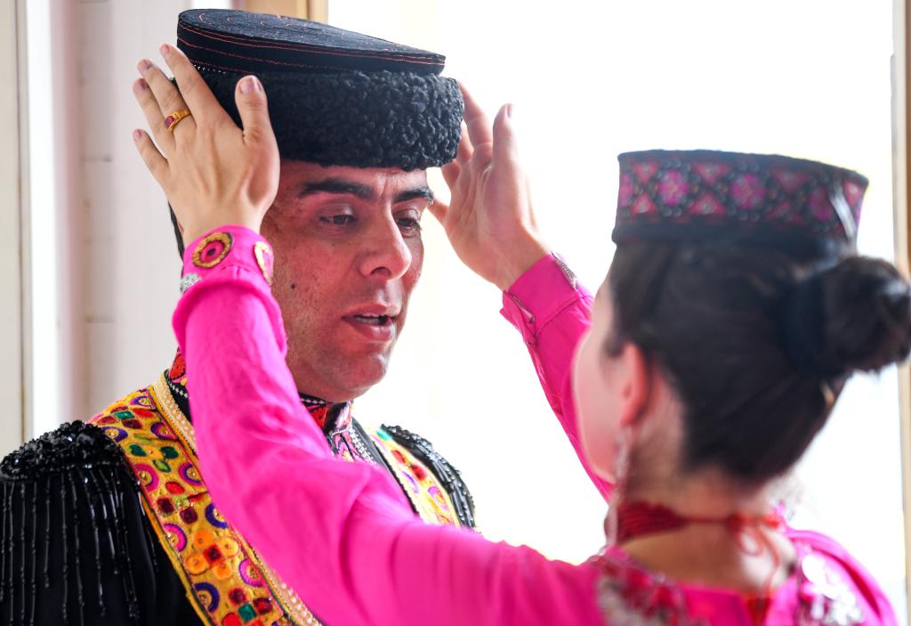 在新疆塔县帕米尔旅游区游客服务中心,拜合提亚尔·居马汗的妻子在排练室帮他整理服饰,准备当天下午的迎宾演出(9月4日摄)。