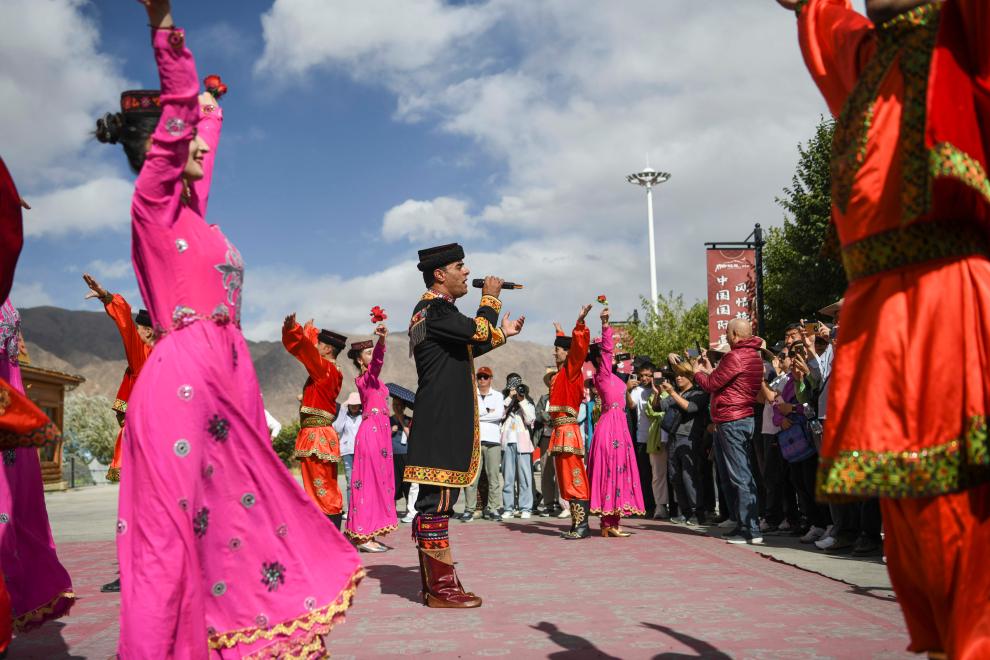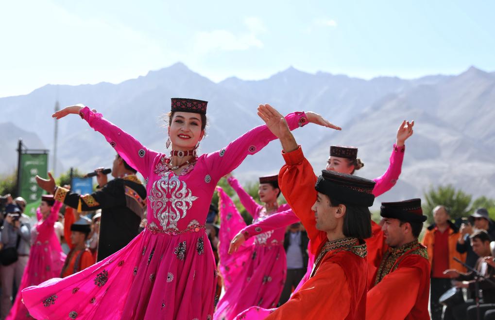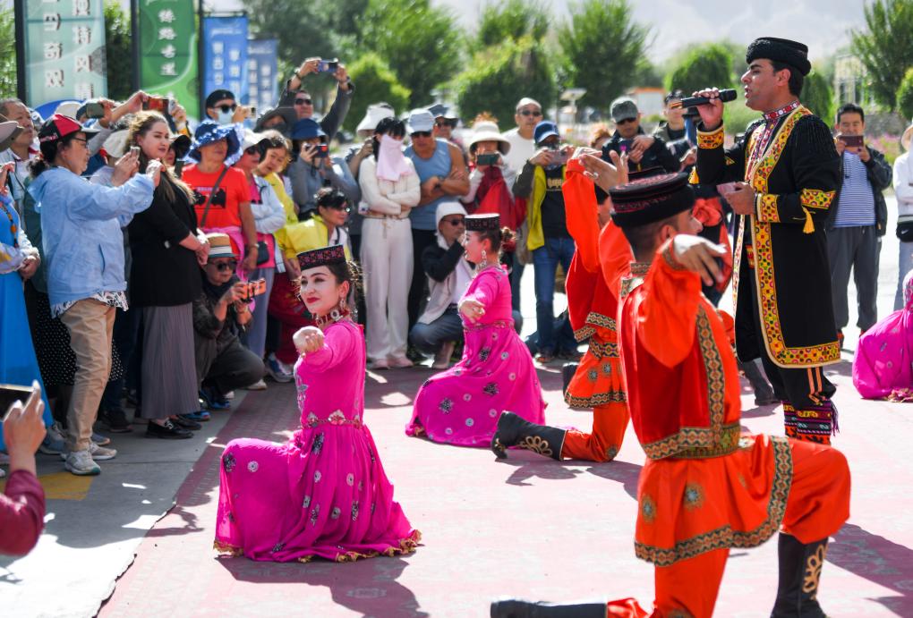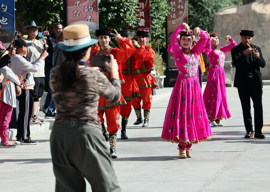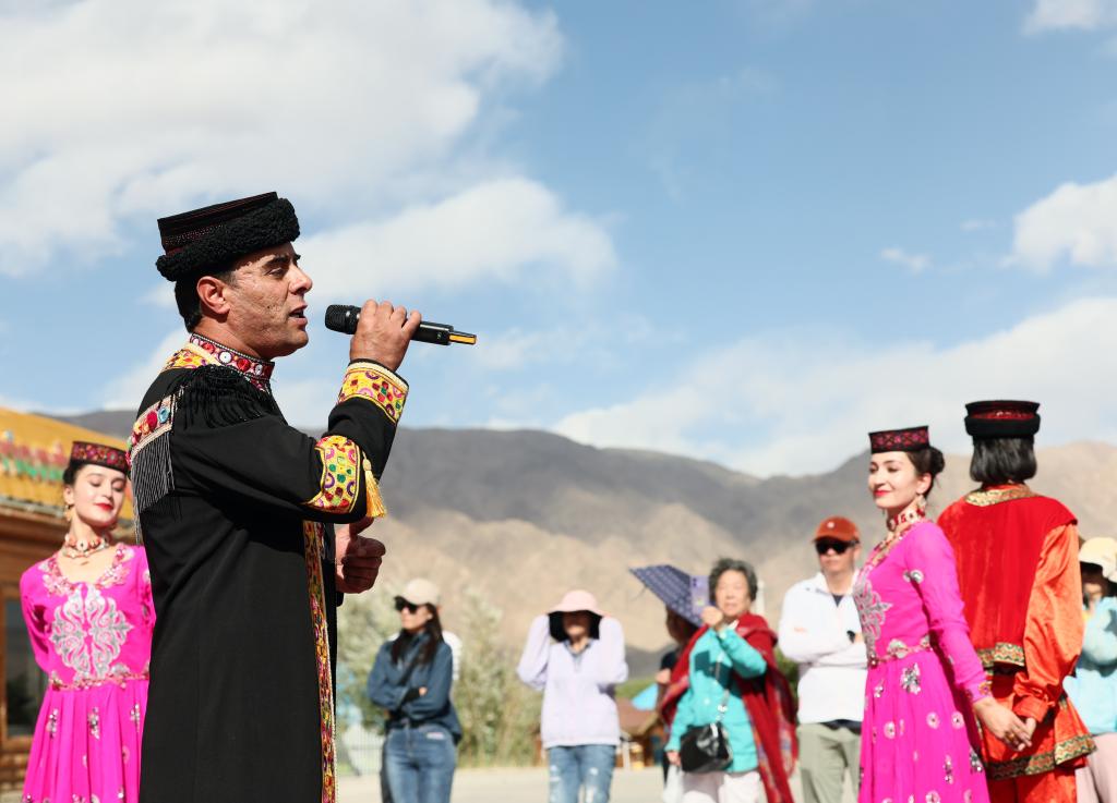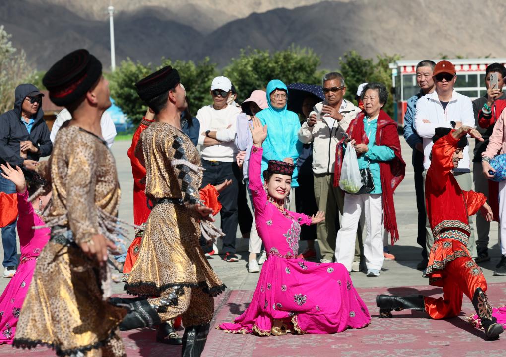 拜合提亚尔·居马汗和妻子古丽巴努尔·库尔恰克与同事们一起表演,欢迎远道而来的游客(9月4日摄)。