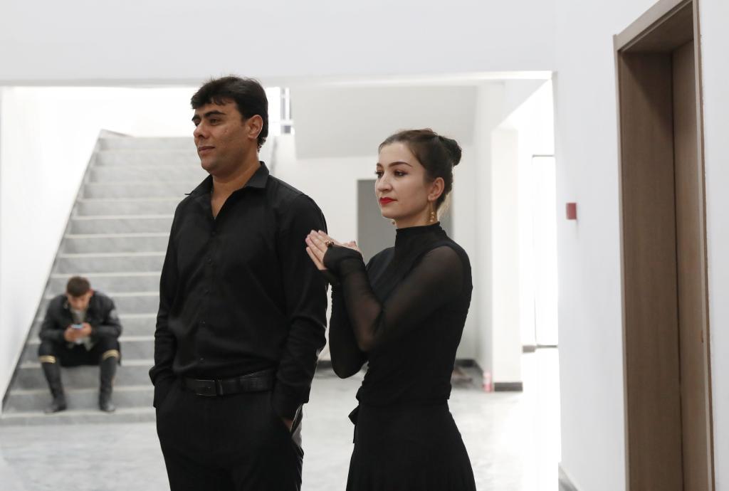 迎宾演出在即,拜合提亚尔·居马汗(左二)和妻子在排练室准备(9月4日摄)。