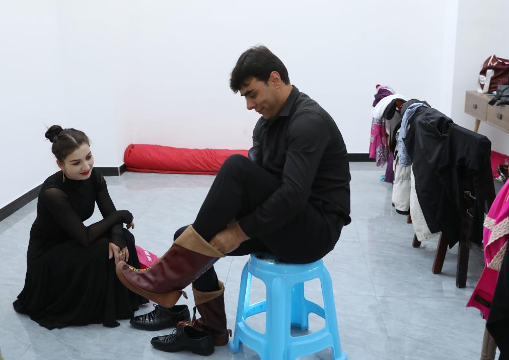 古丽巴努尔·库尔恰克在排练前帮丈夫试穿演出时要穿的靴子(9月4日摄)。