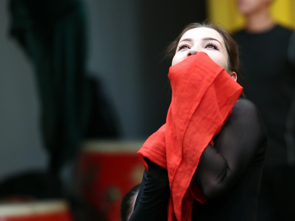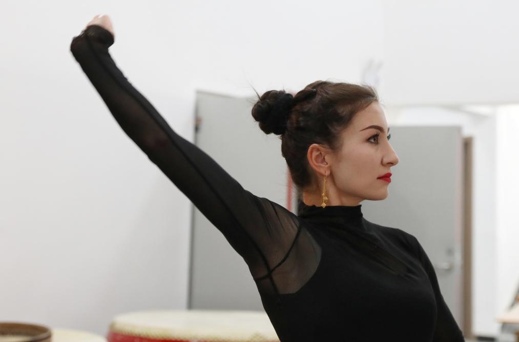 古丽巴努尔·库尔恰克在排练前拉伸身体(9月4日摄)。