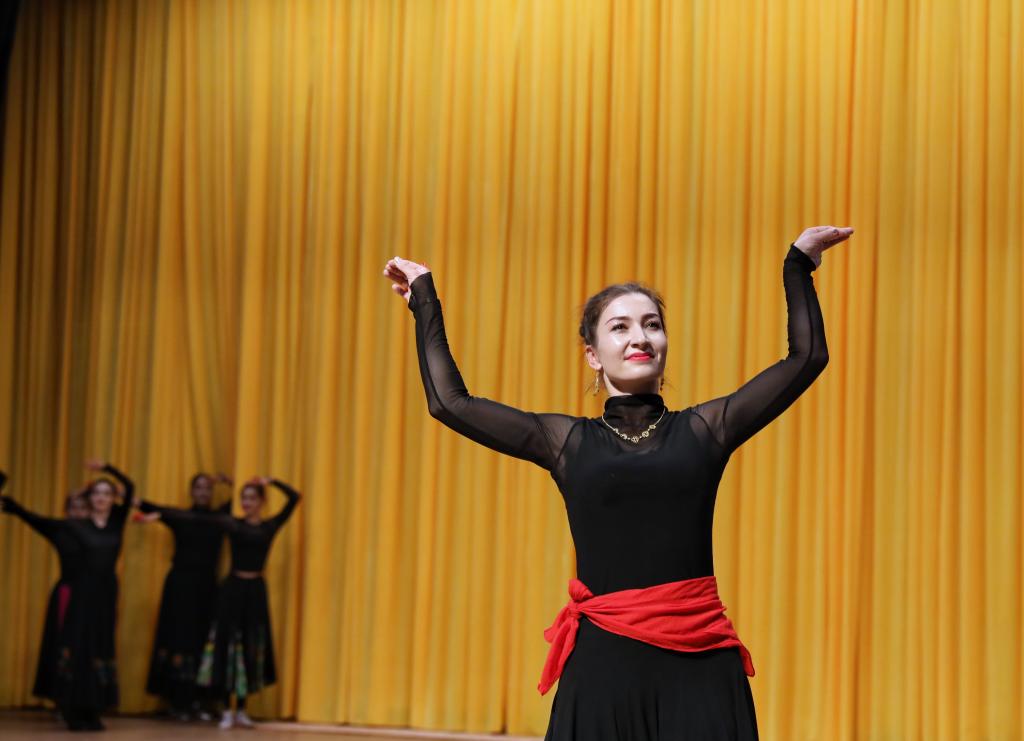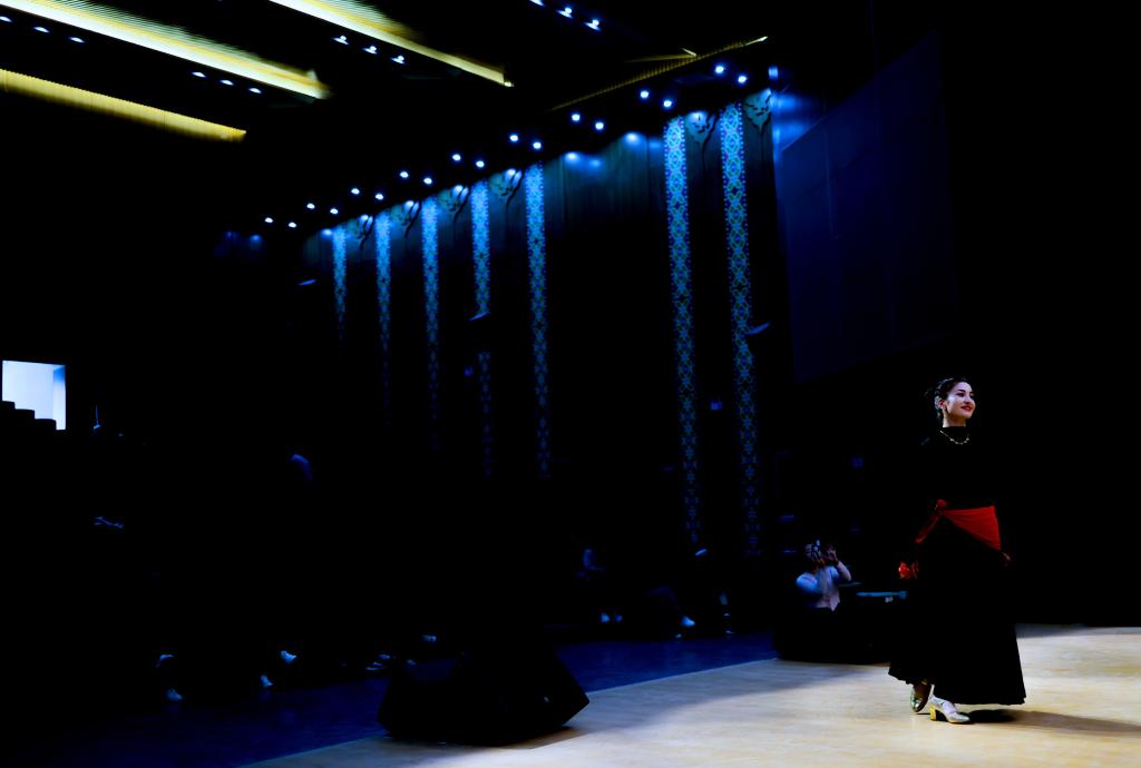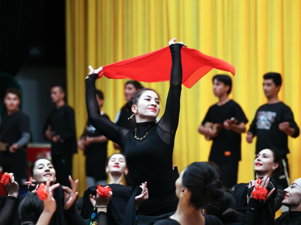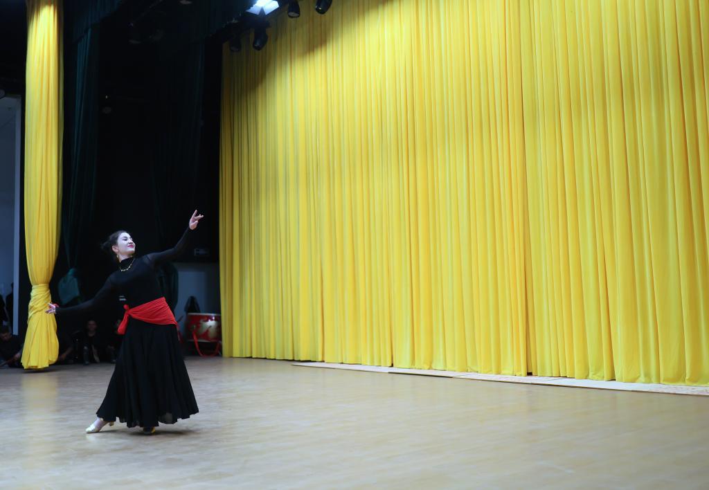 古丽巴努尔·库尔恰克在文化服务中心剧场排练舞蹈节目《花儿为什么这样红》(9月4日摄)。