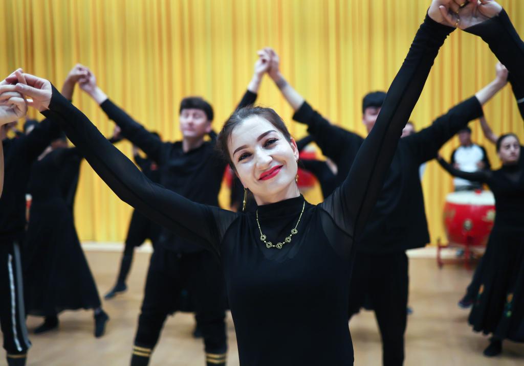古丽巴努尔·库尔恰克(前)和同事们一起排练舞蹈节目《花儿为什么这样红》(9月4日摄)。