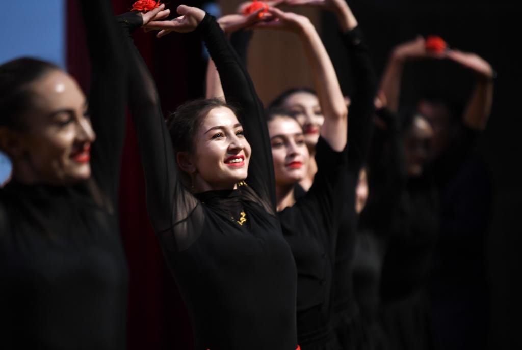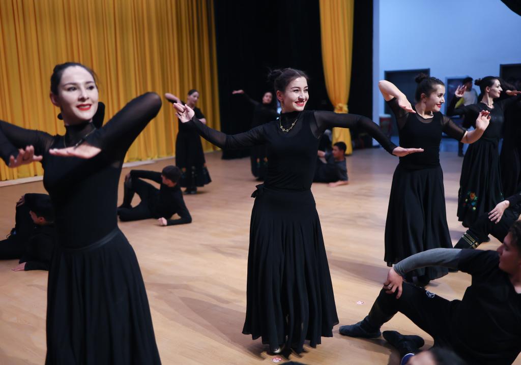 古丽巴努尔·库尔恰克和同事们在排练舞蹈节目《花儿为什么这样红》(9月4日摄)。