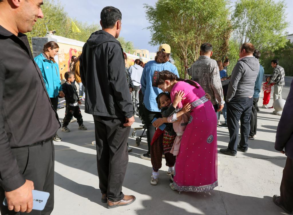 古丽巴努尔·库尔恰克(中)带着孩子们回家,拜合提亚尔·居马汗的母亲出门迎接孩子(9月4日摄)。