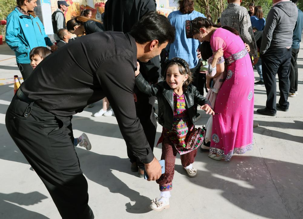 从幼儿园放学的女儿迪力巴努扑向妈妈的怀抱(9月4日摄)。