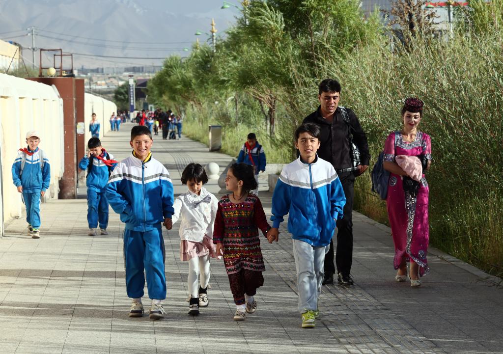 放学路上,拜合提亚尔·居马汗和妻子走在路上,望着前方奔跑嬉闹的女儿(前右)和侄女(9月4日摄)。