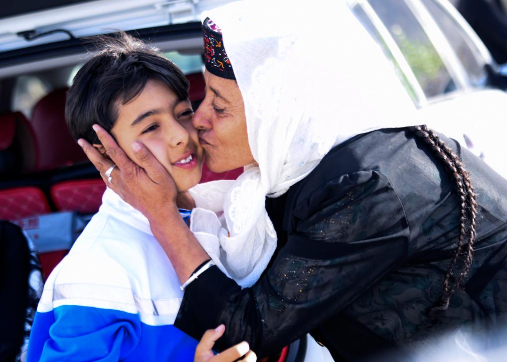 拜合提亚尔·居马汗的母亲亲吻刚刚放学回家的孙子木拉夏提(9月4日摄)。