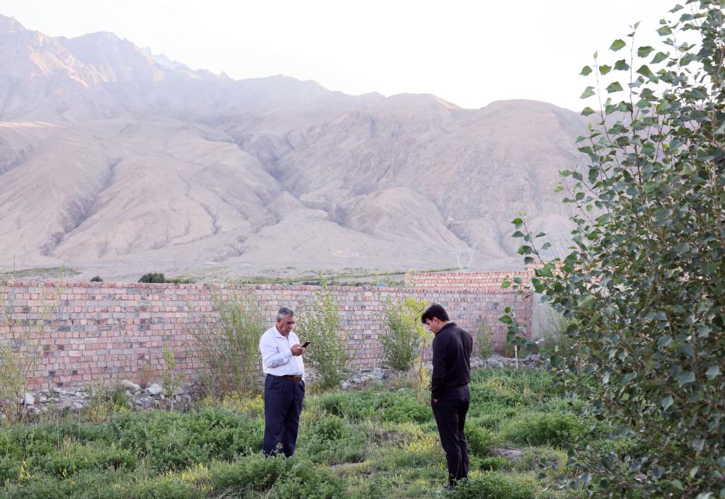 拜合提亚尔·居马汗(右)和父亲站在自家院子里(9月4日摄)。