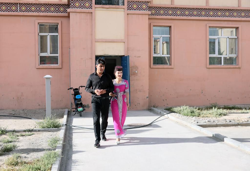 拜合提亚尔·居马汗和妻子并肩走在位于县城的新家楼下(9月4日摄)。