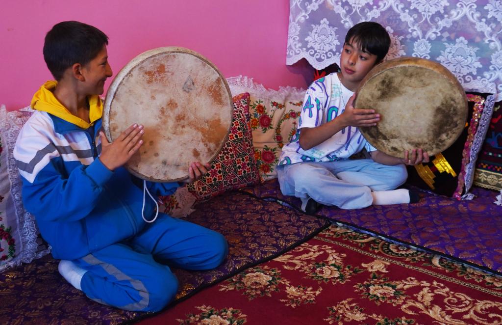 拜合提亚尔·居马汗的儿子木拉夏提(右)与表哥一起敲手鼓(9月4日摄)。