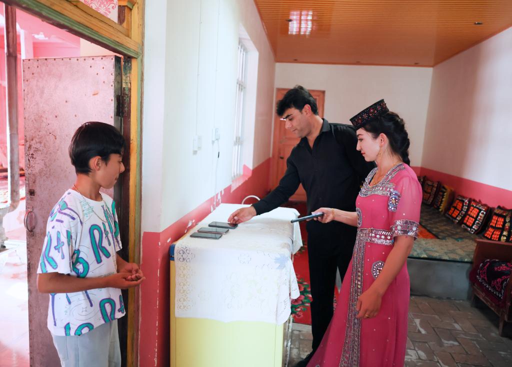 晚饭前,为了让家人能好好聊天交流感情,拜合提亚尔·居马汗和妻子将手机放在另外一个屋子(9月4日摄)。