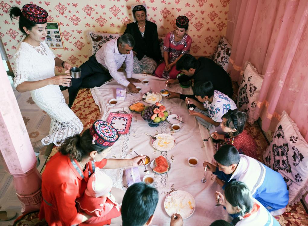 拜合提亚尔·居马汗(左二)和家人在家中吃晚饭(9月4日摄)。