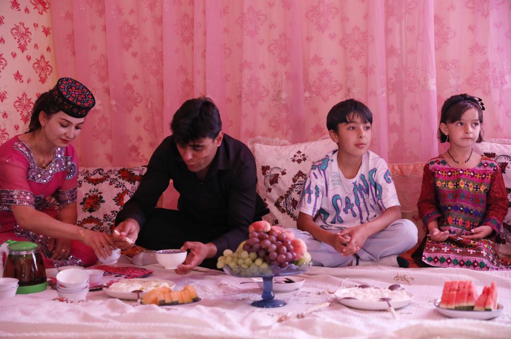 拜合提亚尔·居马汗一大家人在家中吃晚饭(9月4日摄)。