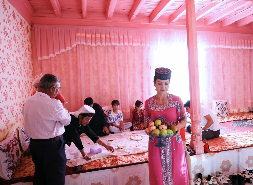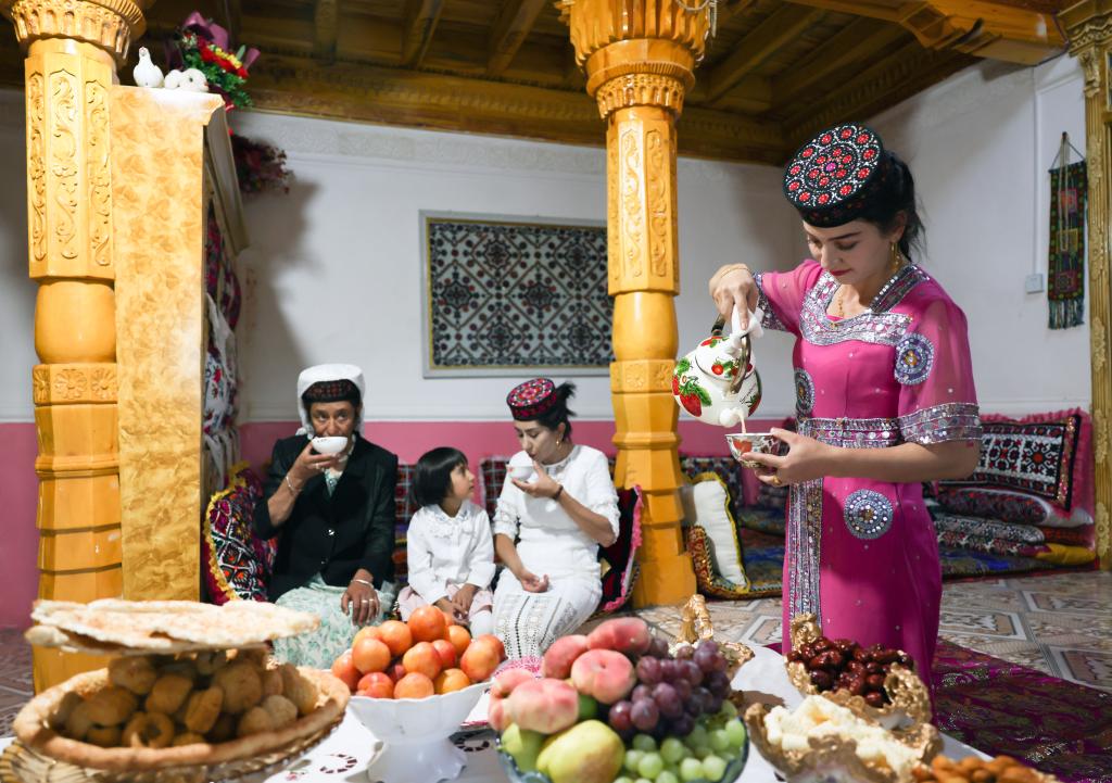 回到家中的古丽巴努尔·库尔恰克(右)为家人们倒上奶茶(9月4日摄)。