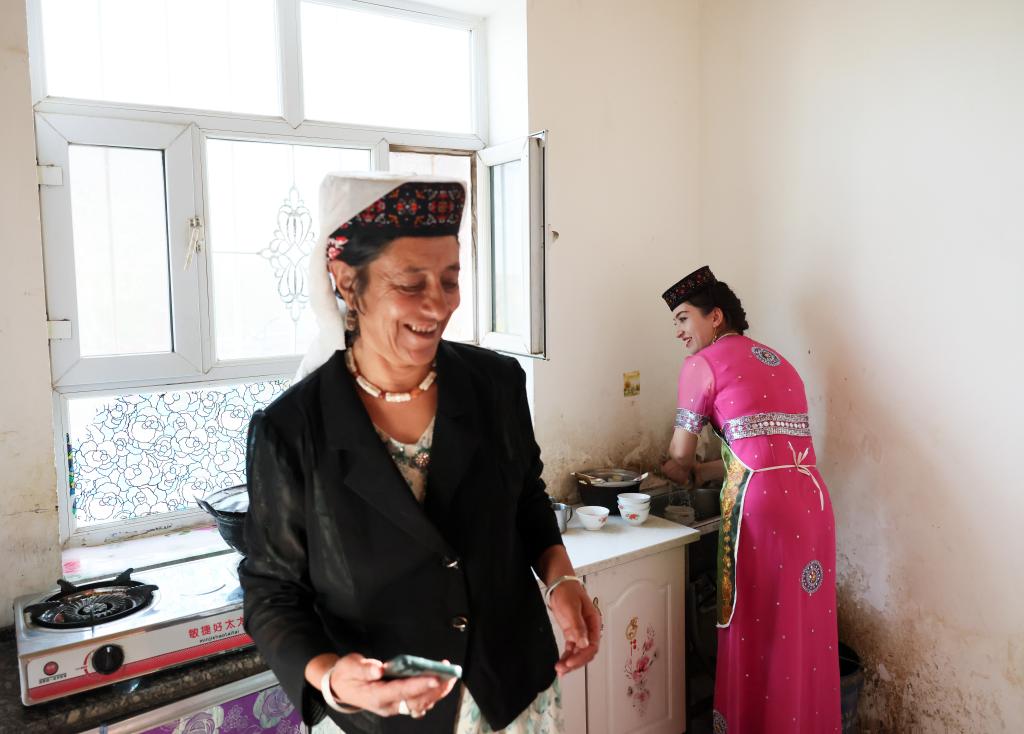 晚饭过后,古丽巴努尔·库尔恰克在厨房洗碗,婆婆在一旁和她拉家常(9月4日摄)。