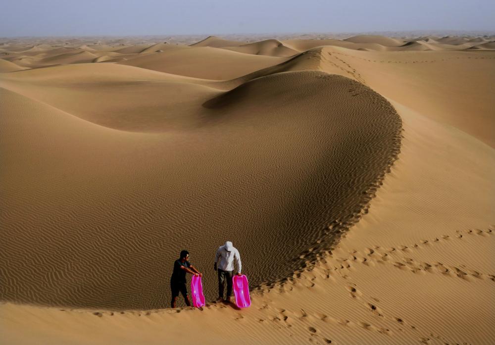 游客在新疆喀什地区麦盖提县N39°沙漠旅游景区内准备体验滑沙(9月7日摄)。