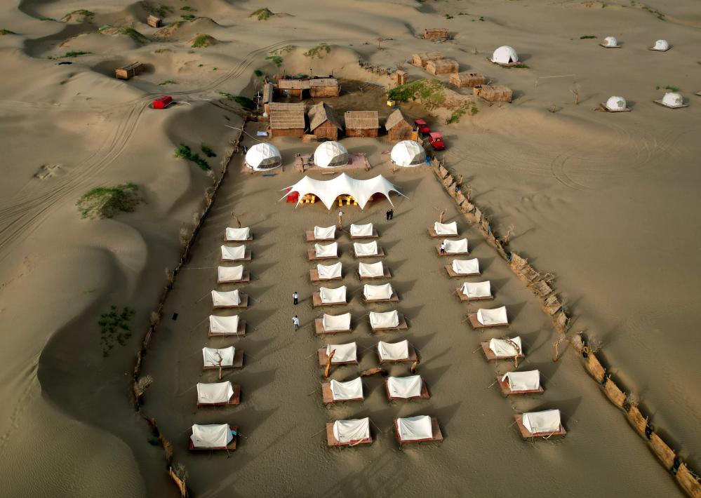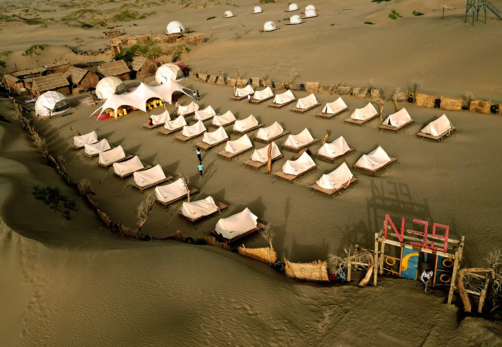 这是新疆喀什地区麦盖提县N39°沙漠旅游景区内的营地(9月7日摄,无人机照片)。
