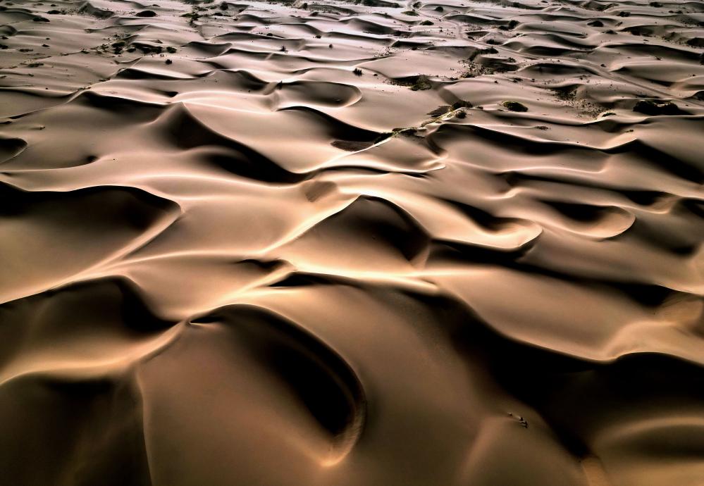 这是9月7日在新疆喀什地区麦盖提县N39°沙漠旅游景区拍摄的沙漠风光(无人机照片)。