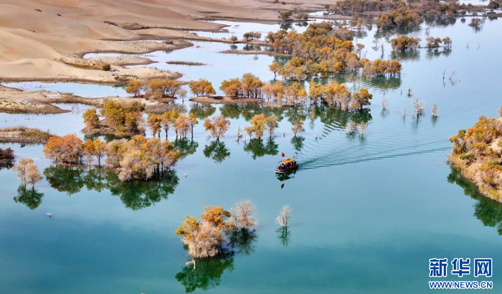 游客乘船在新疆生产建设兵团第二师三十三团的胡杨林间游览(无人机照片,10月20日摄)。新华社记者 李响 摄pagebreak