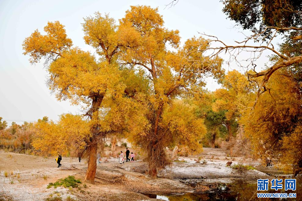 游人穿行在新疆塔里木河沿岸胡杨林间(10月21日摄)。新华社记者 李响 摄pagebreak