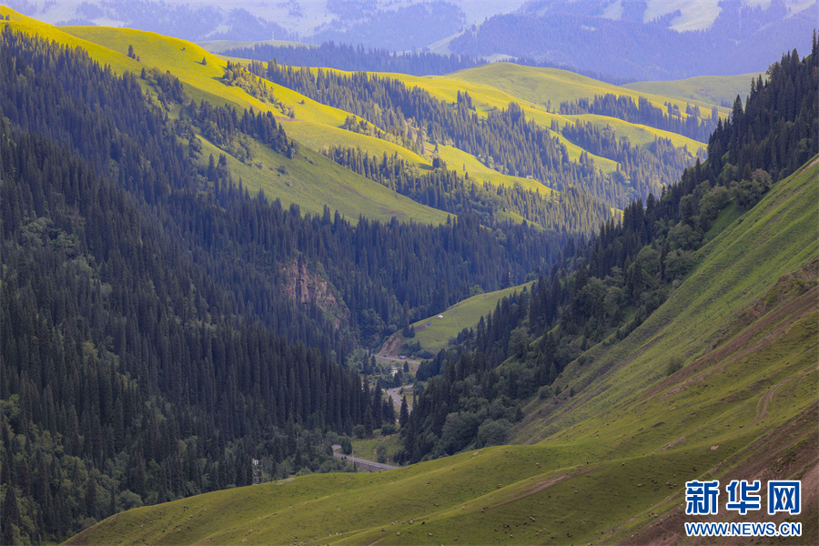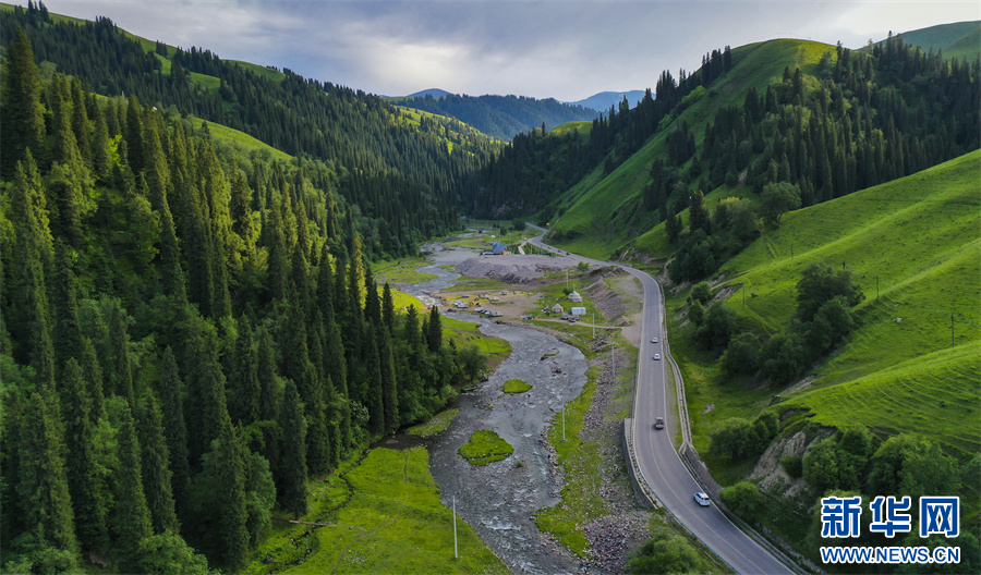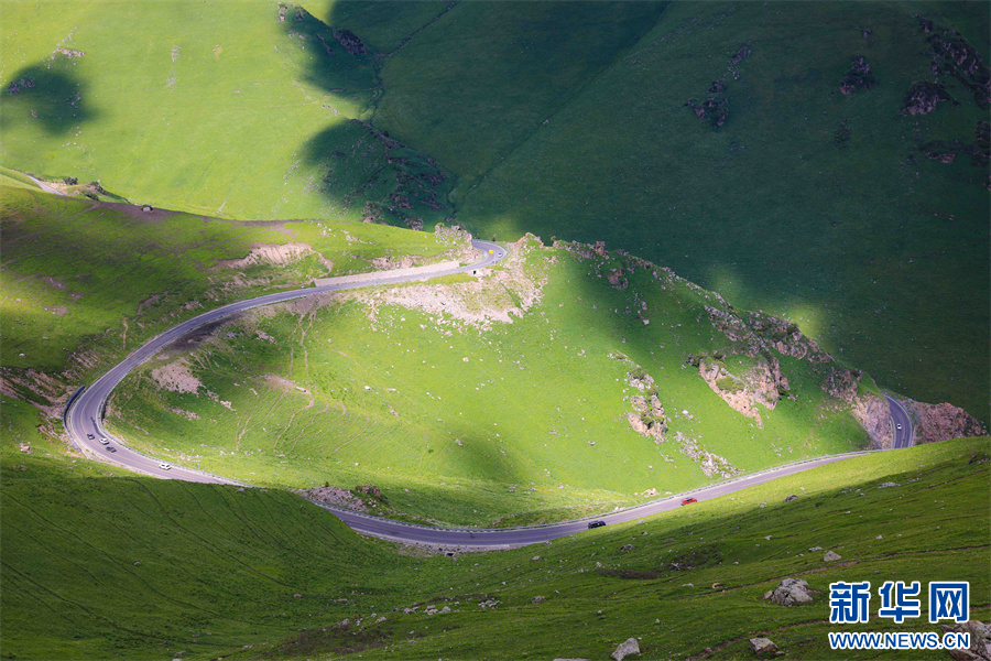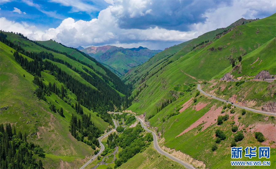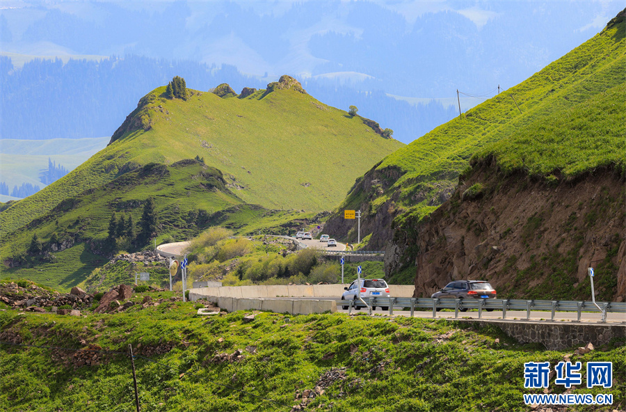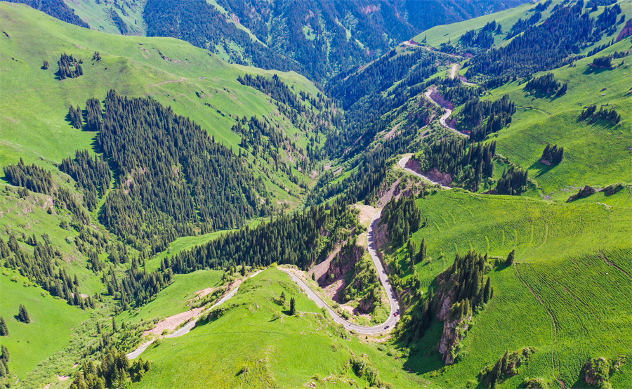 那拉提段独库公路在山谷中蜿蜒盘旋,游客自驾穿梭于群山之间,感受大自然的壮丽与神奇。