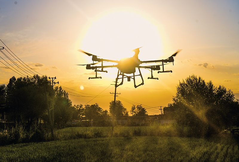 在位于乌鲁木齐市米东区三道坝镇杜家庄村的水稻田旁,植保无人机在种植户的操作下进行水稻病虫害防治喷洒作业(2022年7月4日摄) 王菲摄/本刊