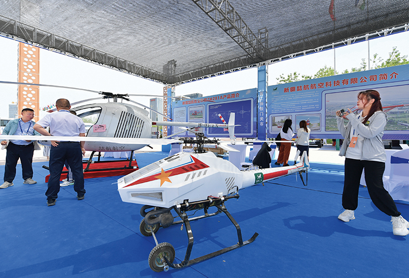 在第八届中国-亚欧博览会上,参观者在新疆喆航航空科技有限公司展区了解展出的智能无人航空器展品(2024年6月26日摄) 王菲摄/本刊