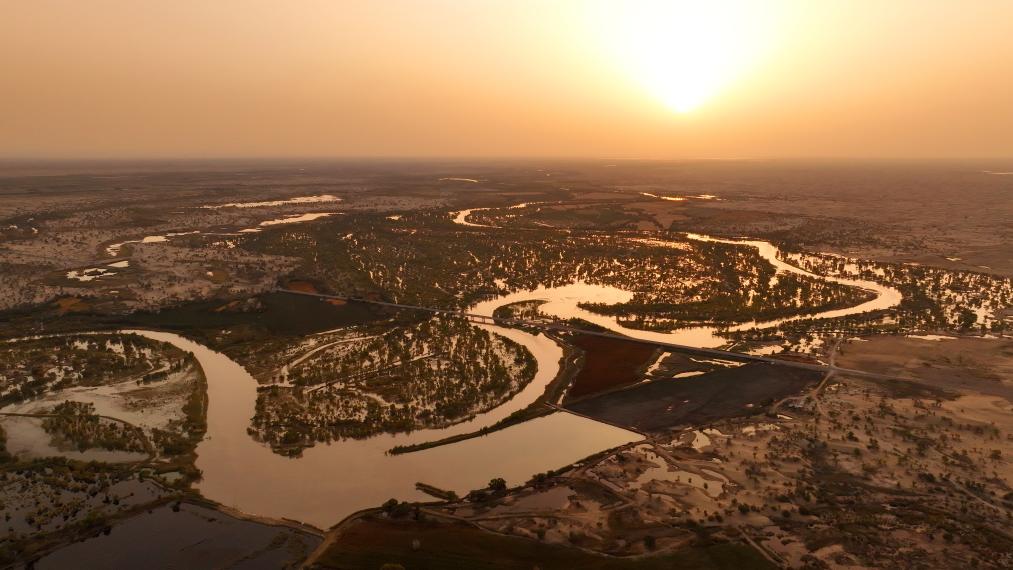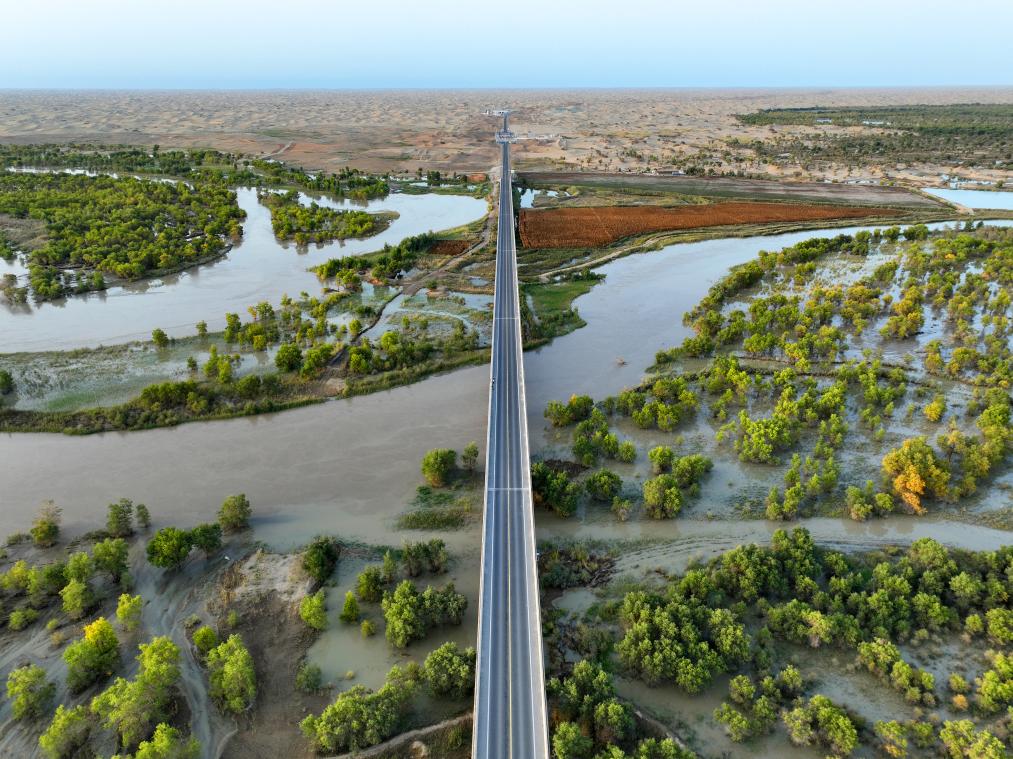 ↑2024年9月23日,在新疆尉且沙漠公路,一轮红日在塔里木河大桥上空升起。(无人机照片)CICPHOTO/确·胡热 摄