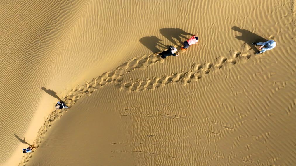 ↑2024年9月23日,游客在新疆尉且沙漠公路“浪沙山”景点段游玩。(无人机照片)CICPHOTO/确·胡热 摄