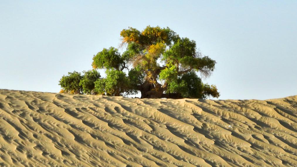 金秋时节,在穿越新疆塔克拉玛干大沙漠的尉且沙漠公路两侧,胡杨、大漠、驼队、蓝天、湿地等构成一幅美丽的生态画卷,吸引游客纷至沓来。