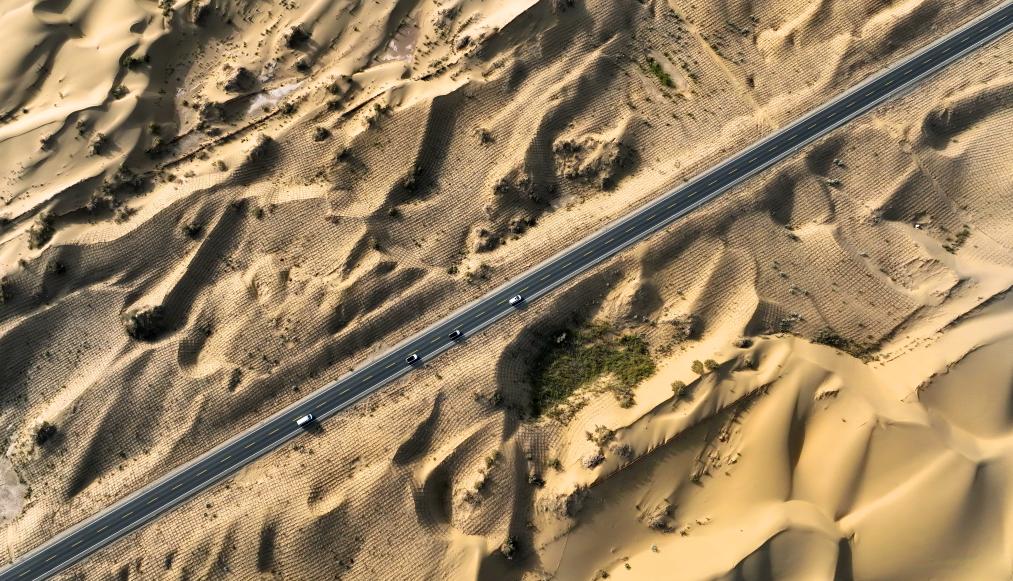 ↑2024年9月23日,车辆行驶在新疆尉且沙漠公路上。(无人机照片)CICPHOTO/确·胡热 摄