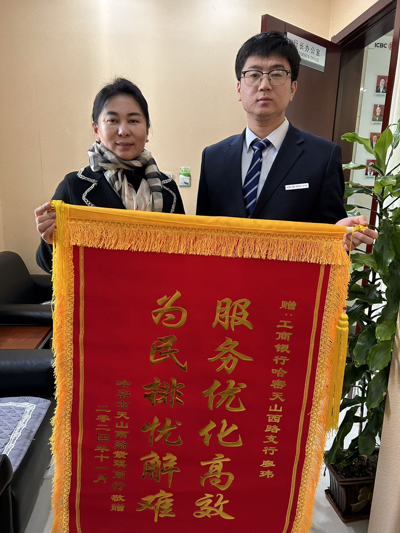 2024年12月3日,工商银行哈密天山西路支行收到某个体工商户送来的一面锦旗,锦旗上书“服务优化高效为民排忧解难”,朴实的言语,鲜艳的锦旗,充分体现出客户的认可与信任。