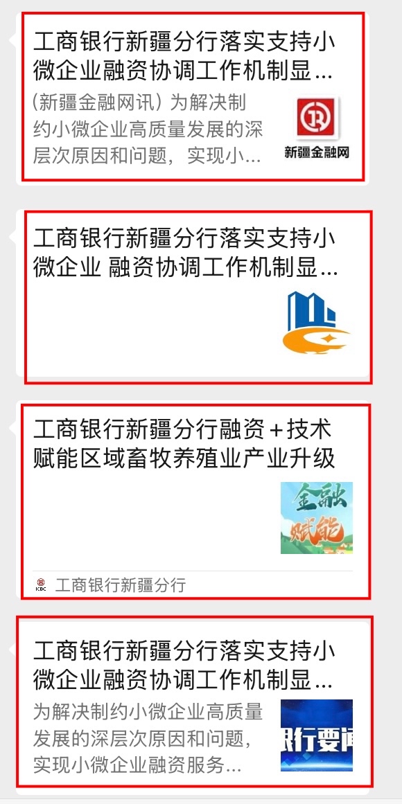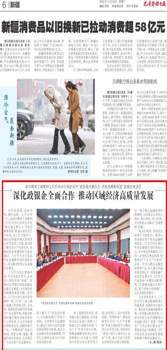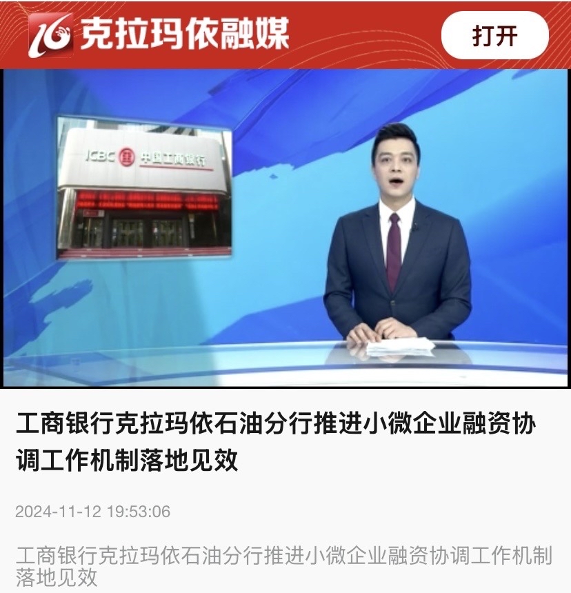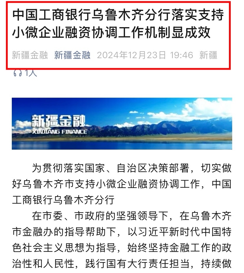 该行多渠道、多形式宣传支持小微企业融资协调工作机制及“千企万户大走访”中典型经验案例。建立落实小微企业融资协调工作机制简报机制,在新疆分行微信公众号新增商户服务专区,铺设数字普惠产品宣传、流程指导、贷款申请入口,发布《千企万户直通贷|工行新疆分行支持中小微信贷产品与服务手册》推文,宣传推广我行各类普惠产品,进一步提高客户产品匹配度,助力营销增量扩面。通过内外部媒体,积极宣传国家一揽子金融政策和新疆分行支持小微协调工作机制先进做法、推动成效等。2024年12月,该行在新疆银行业协会组织的“2024年新疆银行业普惠金融工作成效评比”中,被授予“2024年普惠金融工作先进单位”荣誉称号。