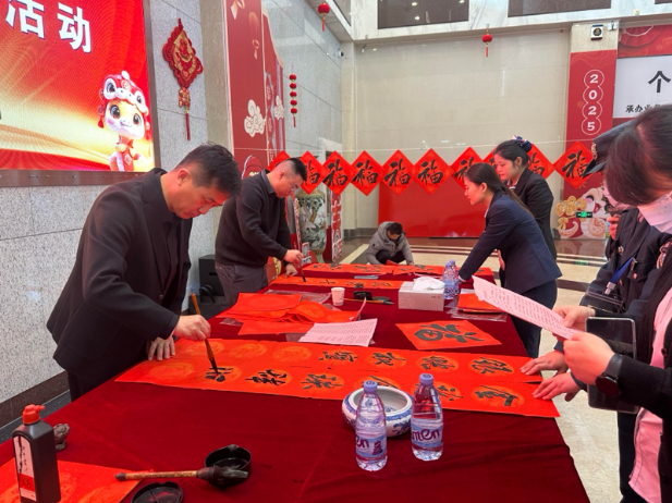 本次活动特邀兵团书法协会2名书法老师,走进基层网点现场免费为一线员工、离退休老同志、劳模工匠、客户写春联和送“福”字,让大家在浓浓墨香中感受幸福年味,把节日的喜庆和对美好生活的祝福融入笔端,向大家送去新春的祝福和美好的祝愿。