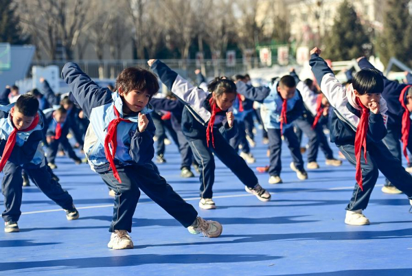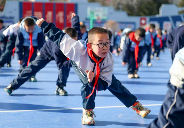 图为在新疆乌鲁木齐县第一中学小学部,学生在大课间做特色体能操(2月21日摄)。新华社记者 王菲 摄