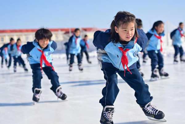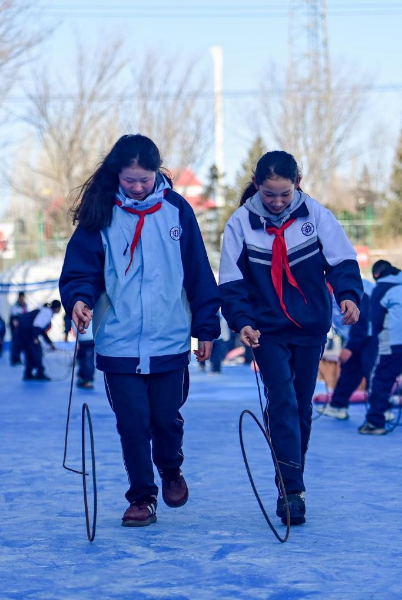 部分学校充分利用场地,积极开展校园冰雪运动。